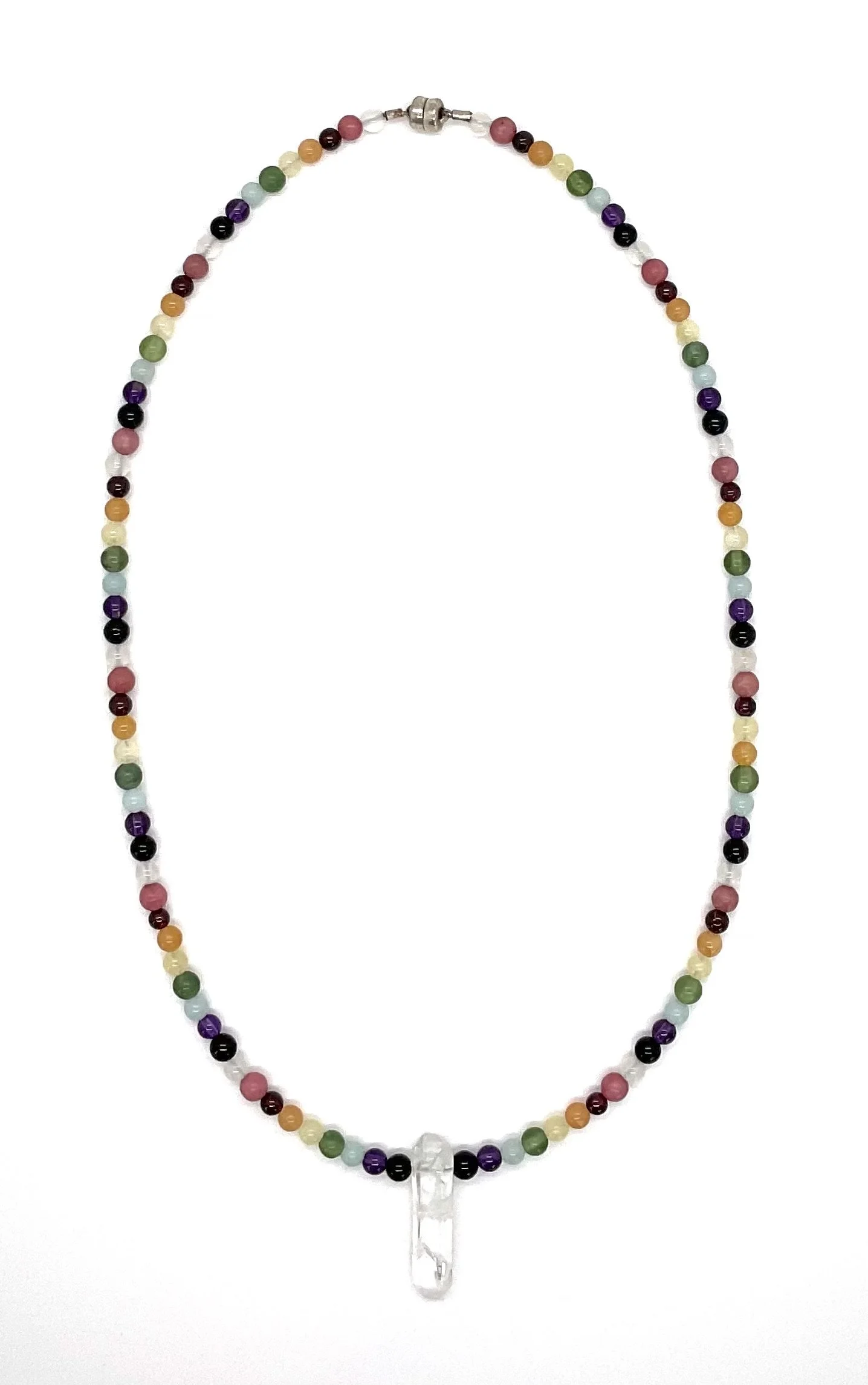 Rock crystal (spirituality) pendant, rhodonite (rescue), garnet (devotion), red adventurine (life force), aragonite (releases fear), serpentine (life energy), amazonite (trust), sodalite (ease), amethyst (Divine connection), onyx (grounding), magnetic clasp* 4mm beads Length 18 3/8”